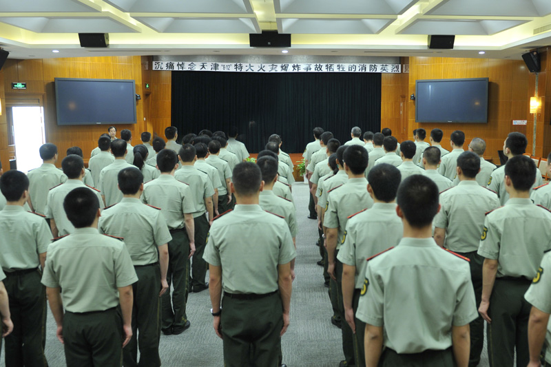 总队举行天津“8.12”特大火灾爆炸事故牺牲消防英烈“头七”悼念活动 8月18日上午11时,总队机关在21楼会议室举行天津“8.12”特大火灾爆炸事故牺牲消防英烈“头七”悼念活动,沉痛缅怀牺牲战友和遇难者。王新建政委、陈子浩总队长以及总队在家的党委常委、机关全体官兵、消防文员参加。悼念仪式由政治部余昌带主任主持。